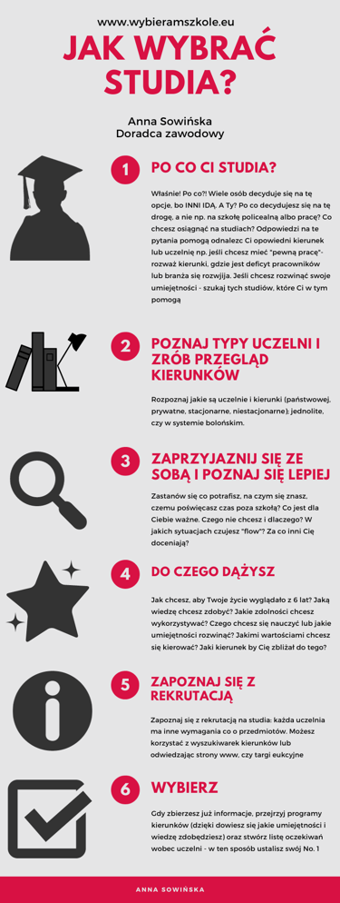 Dodam, że jeśli jesteś w klasie 8 lub maturalnej to pomyśl nad tym „co dalej” właśnie TERAZ. Poniżej zamieszczam grafiki jak przygotować się do wyboru odpowiedniej ścieżki edukacyjnej. Chcesz rozpoznać swoje zasoby, dowiedzieć więcej o rynku pracy lub edukacji, poznać techniki planowania, dzięki którym bez napięcia i żalu podejmiesz decyzje? Zapraszam do kontaktu.